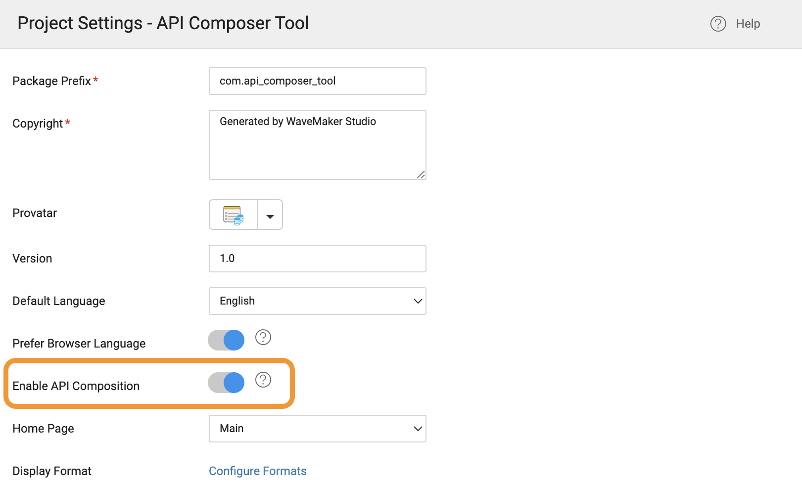 For existing projects or after creating a project, you can go to the Project Settings dialog and enable or disable API Composition as required.