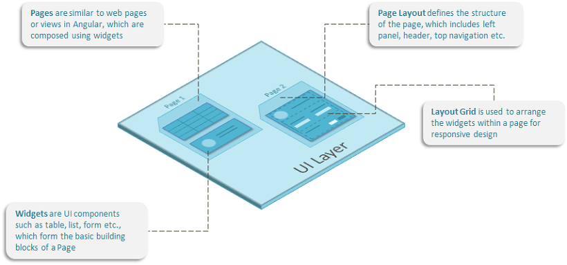 An application is a collection of pages. Each page is composed of different UI elements and Widgets. These UI elements enable user interaction with the app and can get data from the backend services. You can be set navigation and interaction rules across pages.