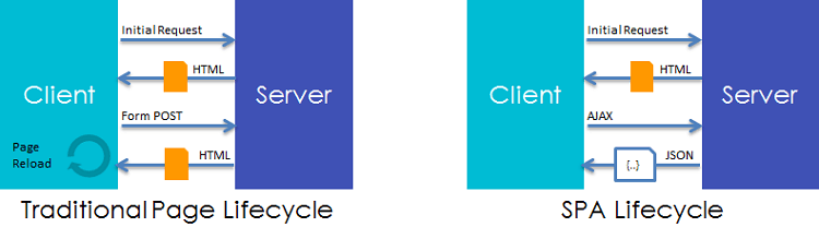 Single-Page Applications (SPAs) are Web apps that load a single HTML page and dynamically update that page as the user interacts with the app. This is achieved through a clear separation of front-end and backend through AJAX Service, thus cutting full roundtrip to the server to retrieve new presentation content (HTML) which is common to traditional page life cycle.