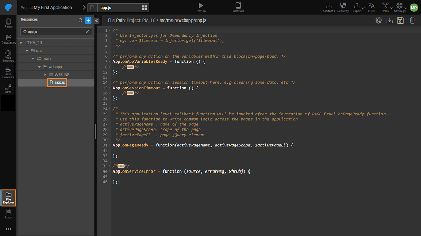 As with the Pages, App lifecycle events and variables can be accessed from the app.js file. This file can be accessed from the File Explorer.