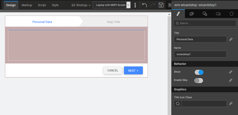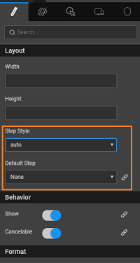 • Default Step: bindable property acting as the starting point for the wizard. For instance, if default step is set to step 3, then at runtime the third step is the active step on a load of the wizard with the previous two steps marked as complete.