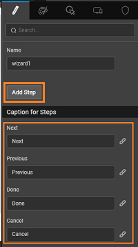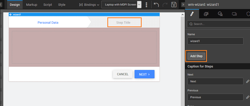 • Next and Previous: To navigate through the steps of the wizard we have Next and Previous buttons in the wizard widget. The caption for these buttons can be changed using the Next caption and Previous caption properties available in the Wizard basic properties. The captions are also bindable.