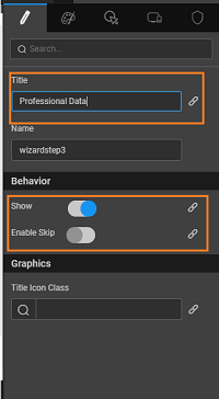 • Show: The Wizard step can be shown or hidden by checking it on/off. The step can also be shown or hidden by binding the show property to a boolean field.