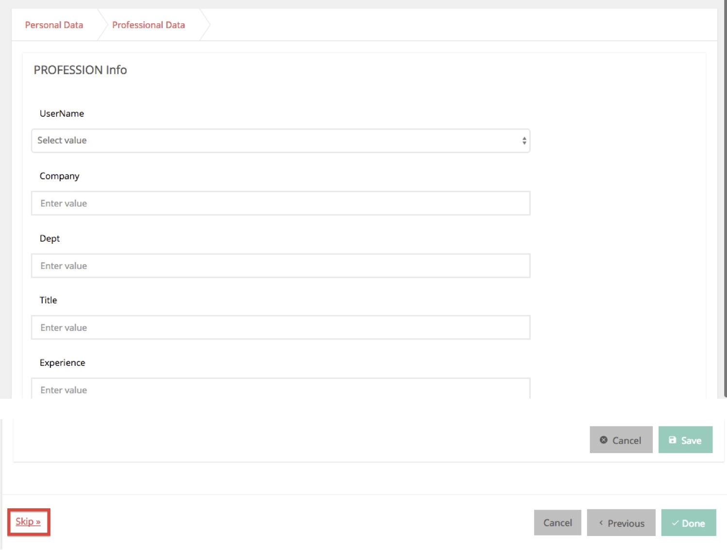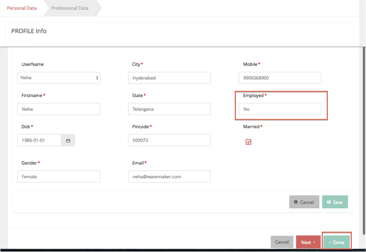• On Done: Use Case –When the User is Employed. In this case, the user is allowed to move to the next step to enter professional data. Once entered and Done button is clicked, On Done event fires. A JavaScript handler is added to On Done Event which does the following: