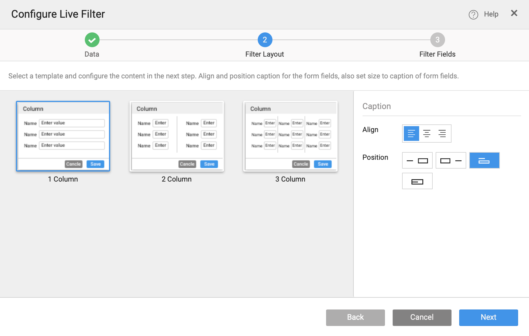 Select the Live Filter Layout from one-column, two-column or three-column. You can also specify the Caption Alignment, Position, and Size.