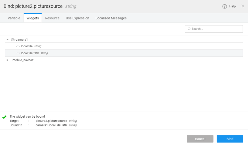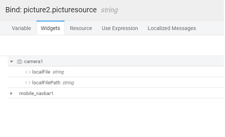 6. Bind the source of the picture to the ‘localFilePath’ of camera widget.