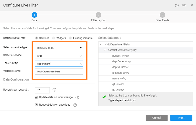 1. Drag and drop a filter onto the canvas, setting the Service Type to Database CRUD, using hrdb Service and Department entity. Select Name for the Filter Fields.
