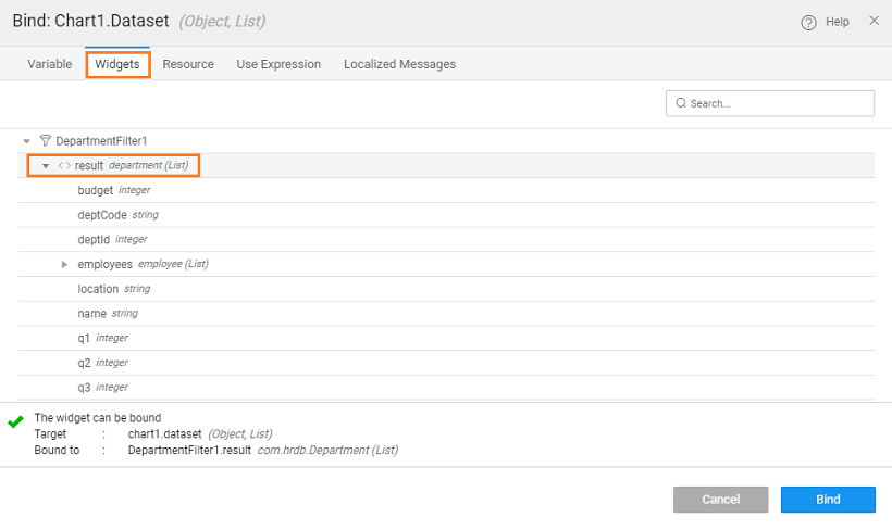 4. Select the Result of the filter you just created from the Widgets tab on the Bind dialog box.