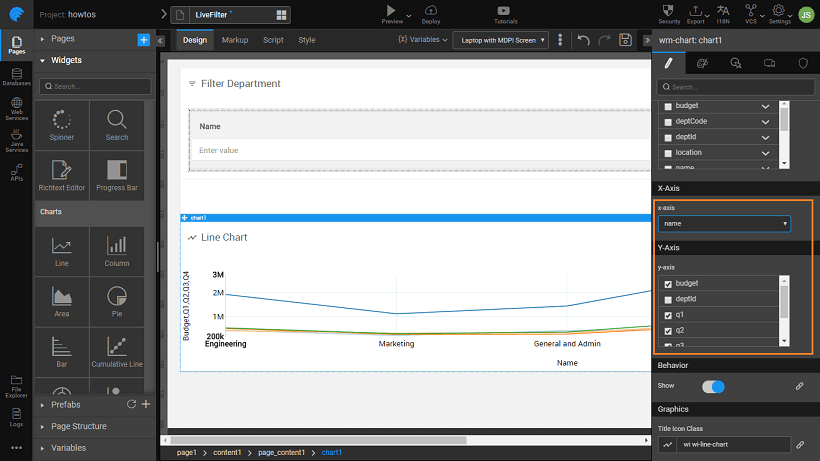 5. Select the x-axis and y-axis values for the chart. (in case of Data Table, select the columns to be displayed at the time of configuration or from Advanced Settings)