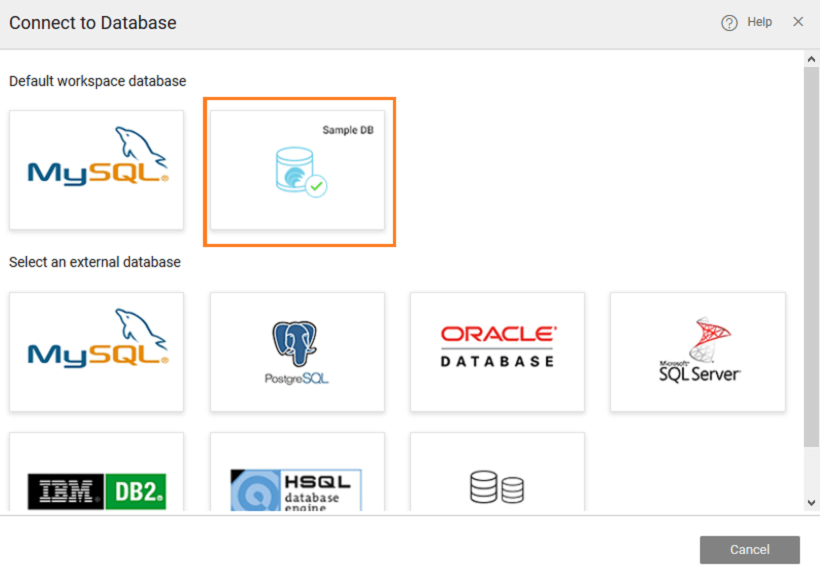 1. You need to choose the Database Provider of the database being imported. For this tutorial, we will use the inbuilt sample database that ships with WaveMaker. Click sample database link.