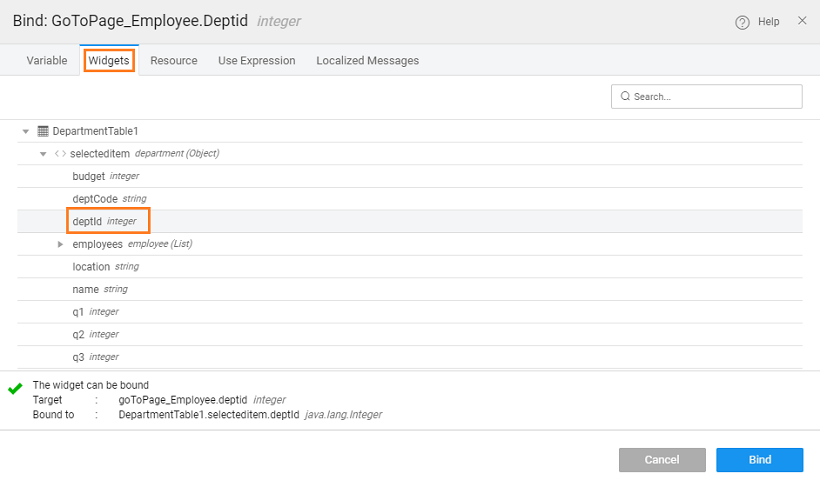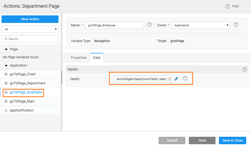 1. Pass Parameter: Now we need to pass the selected row deptid to the Employee page. Select the goToPage_Employee from the Actions dialog and select the Data tab. Click the bind icon next to the deptid
