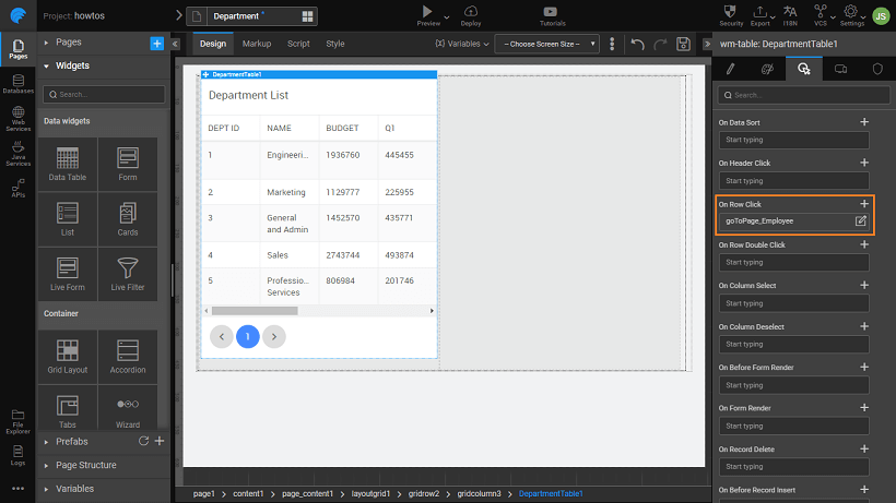 3. Page Navigation: From the Events tab, set the On Row Click event to goToPage_Employee.