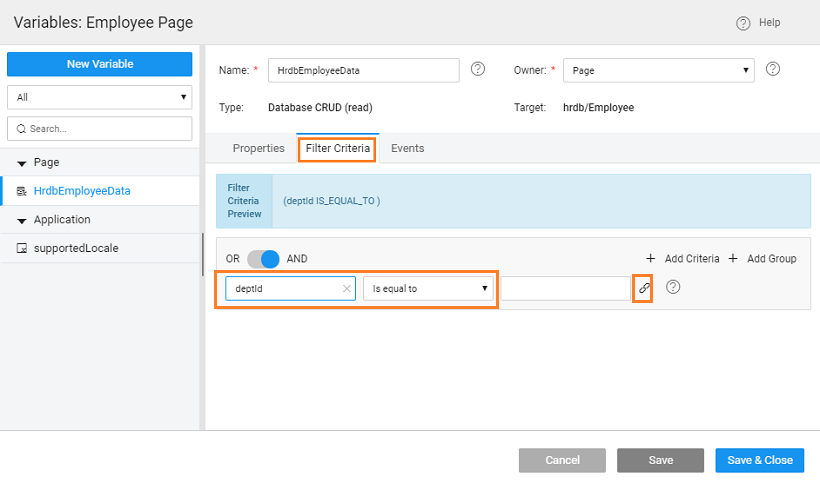 1. Filter Employees: Next, we need to set the filter on List to display employee details for the department passed to this page. Select the List and locate the Value property under Dataset, click it to open the Employee Variable dialog. (You can also access the Variable from the Variables dialog). Under Filter Criteria tab add deptid, set the condition to Is equal to and click the bind icon for the value