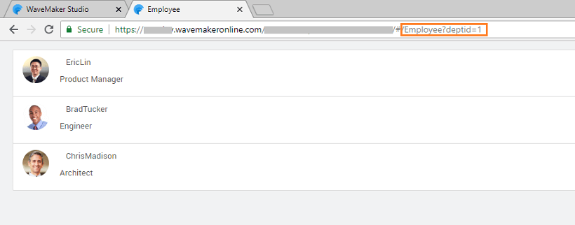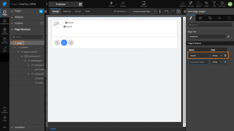 3. Since Employee details have to be filtered based upon the selected Department, create a page parameter for the Employee page. Use this parameter to filter the list items.