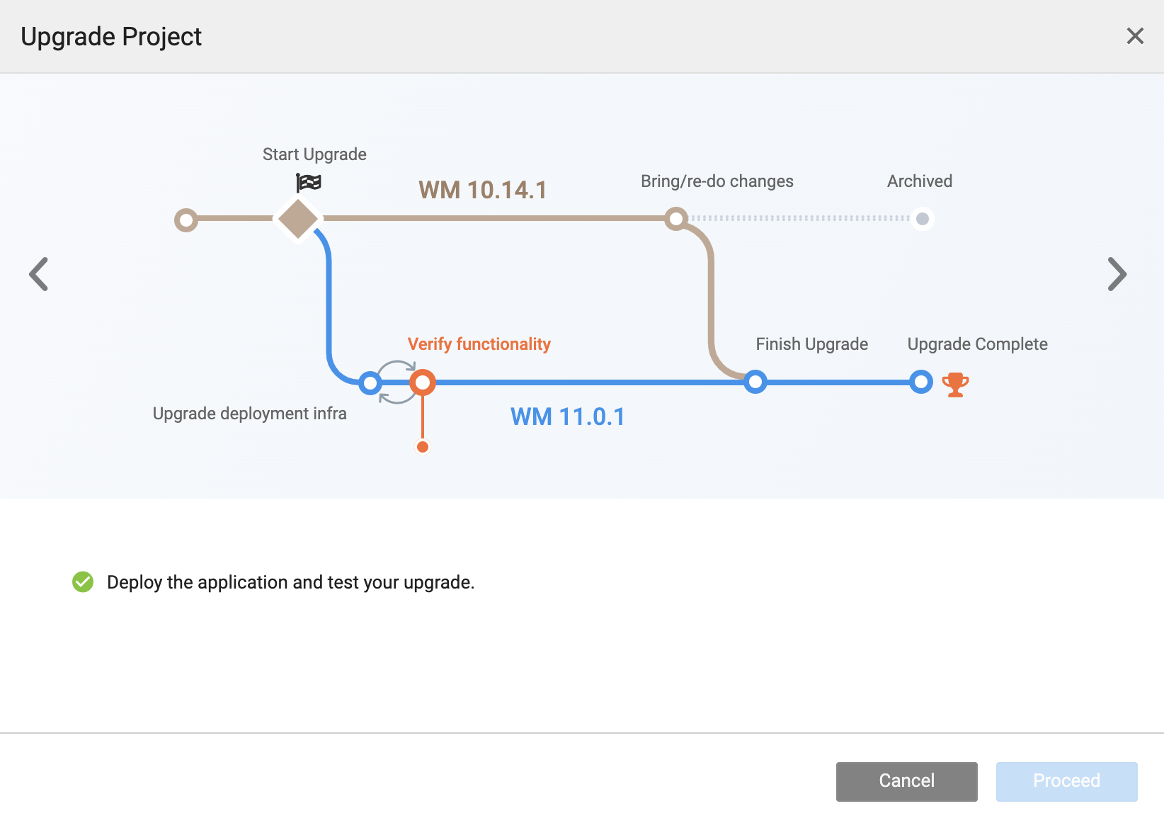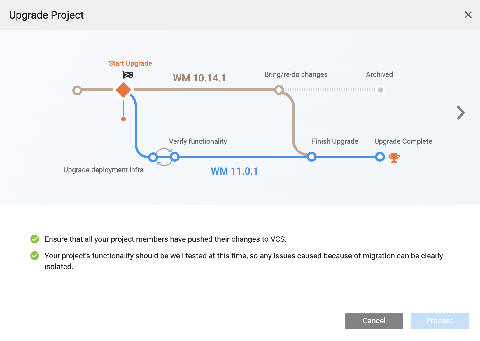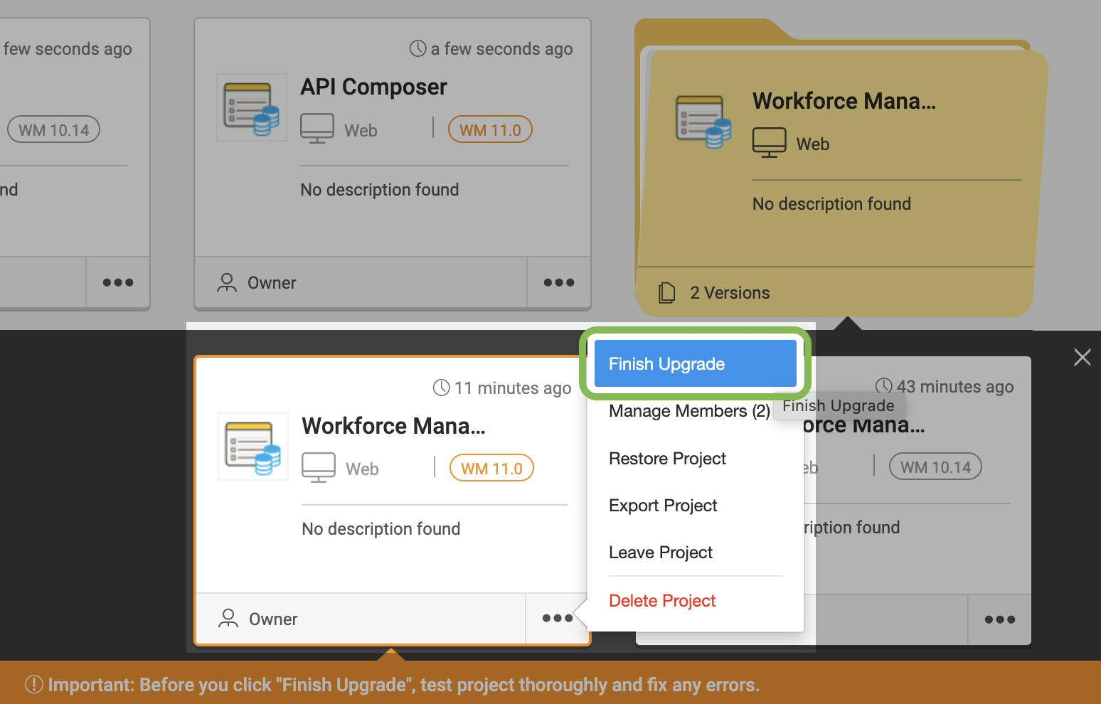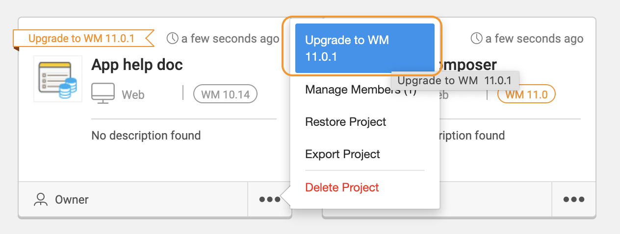 • Navigate to the three dots of the project card and click Upgrade to WM 11.0.1.