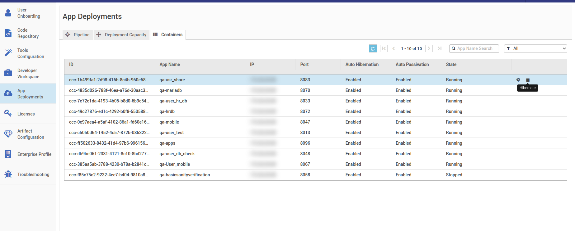 - After this is done in all StudioWorkspace instances cross-check the running containers in the containers tab, all the containers should be in the passivated state