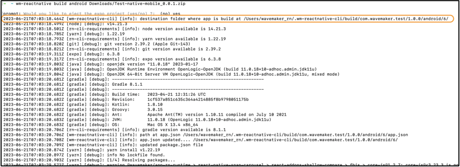 When the build gets completed, wm-reactnative-cli prints out the path at which the generated APK is present.